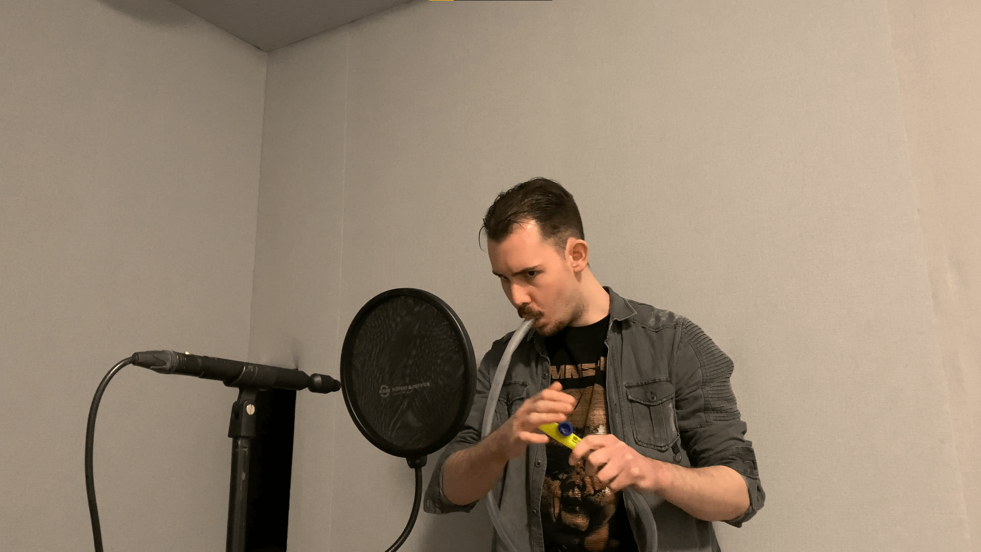 To get the slime and other gadgets, he browsed on the web and hit construction stores, to find random odds and ends that can be used in creative sound-design-y ways. “There are a lot of cheap props, especially stuff that kids could play with like kazoos, pop tubes, or slime. Music stores often have simple things such as mouth pieces, pipes, or whistles. And of course, asking friends if they’ve got anything that produces odd or weird sounds.”