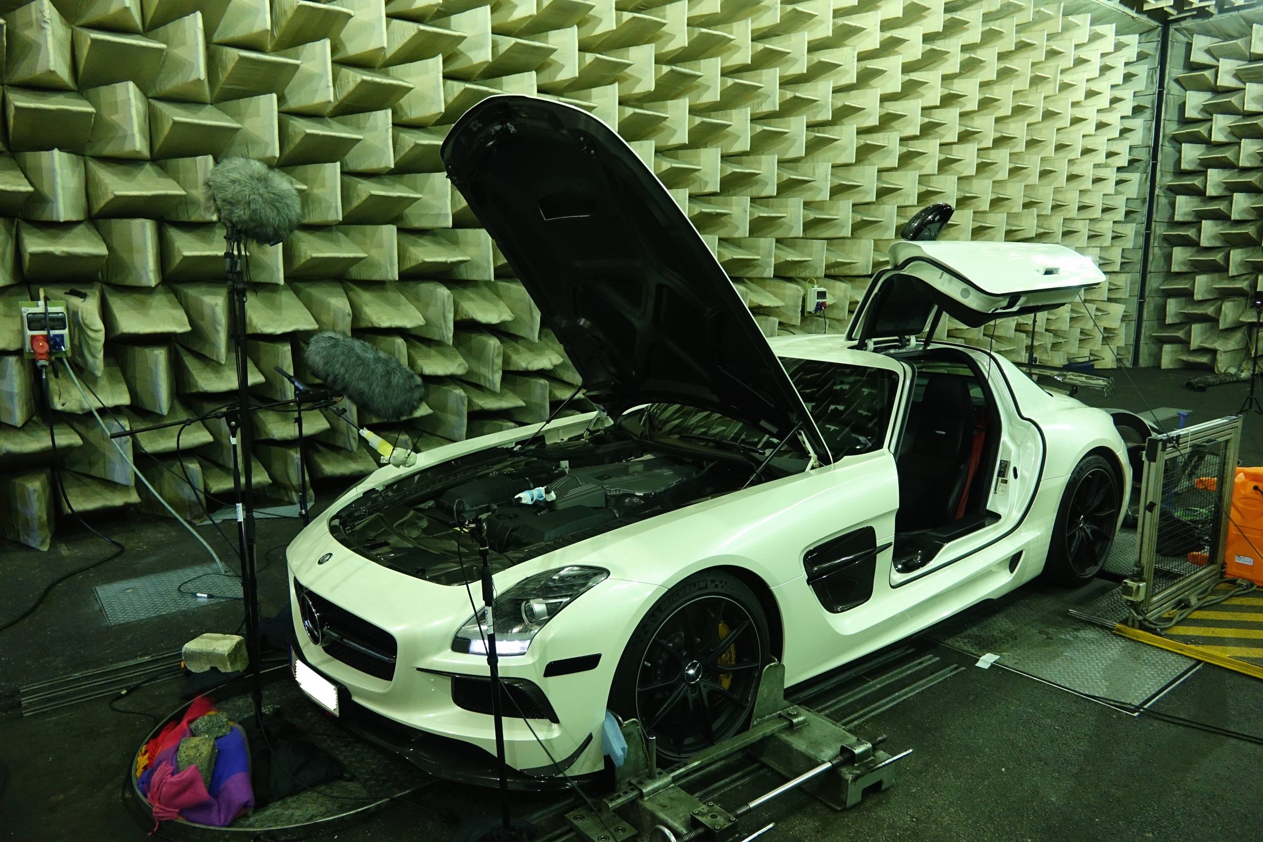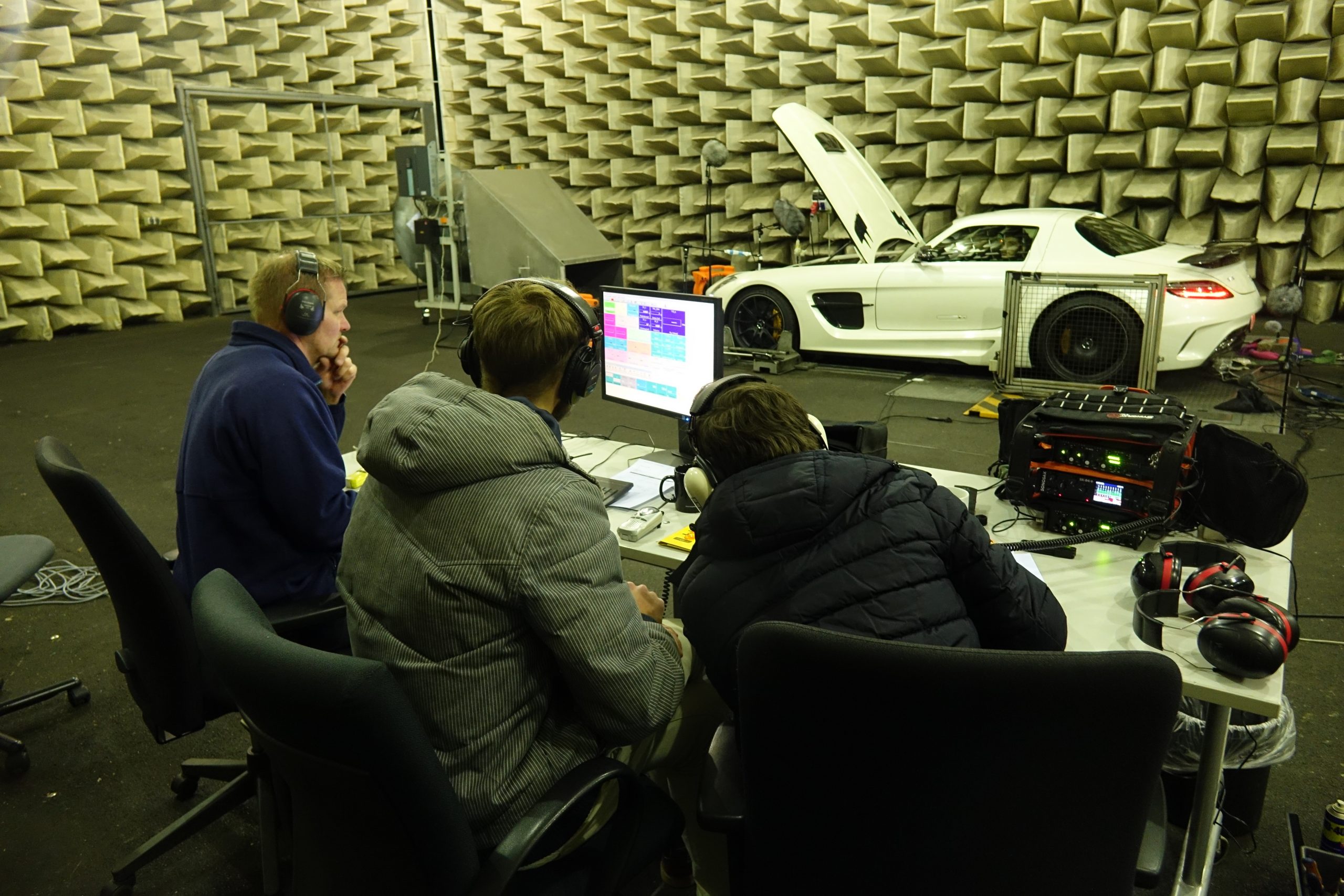 Of course, recording cars isn’t a simple job. It’s impossible to just drive a car into our recording studios, and you can’t record it on the street or in a garage, since the acoustic and ambient properties wouldn’t allow us to have such control over the sound. To do the recording, Axel and Patrice needed a neutral acoustic environment. Axel searched through Germany and found a semi-anechoic chamber – that is, a large, acoustically treated room.