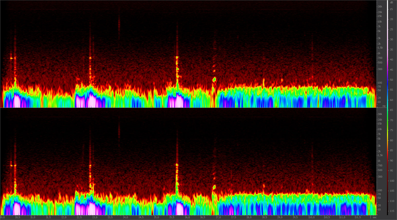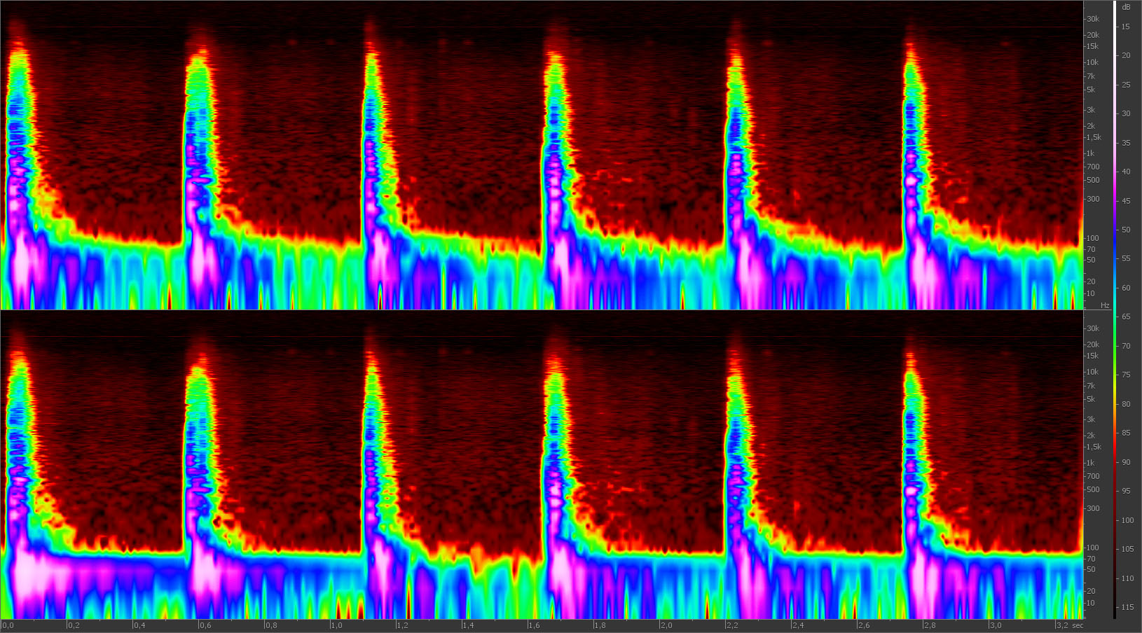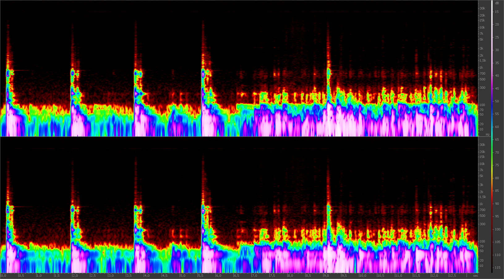 Before we start, here is a short explanation of spectrograms for those who haven’t seen one before: A spectrogram is the visualization of the frequency spectrum of a sound in relation to the dimensions time and amplitude. On the horizontal axis you can see a timescale and on the vertical axis on the right a frequency and amplitude scale, ranging from black (-115db) over red (-90db) and blue (-50db) up to white (0db). Because we recorded in stereo there are two channels. Left one on the top and the right channel is on the bottom. We used iZotope’s RX4 export function for the spectrogram-screenshots.