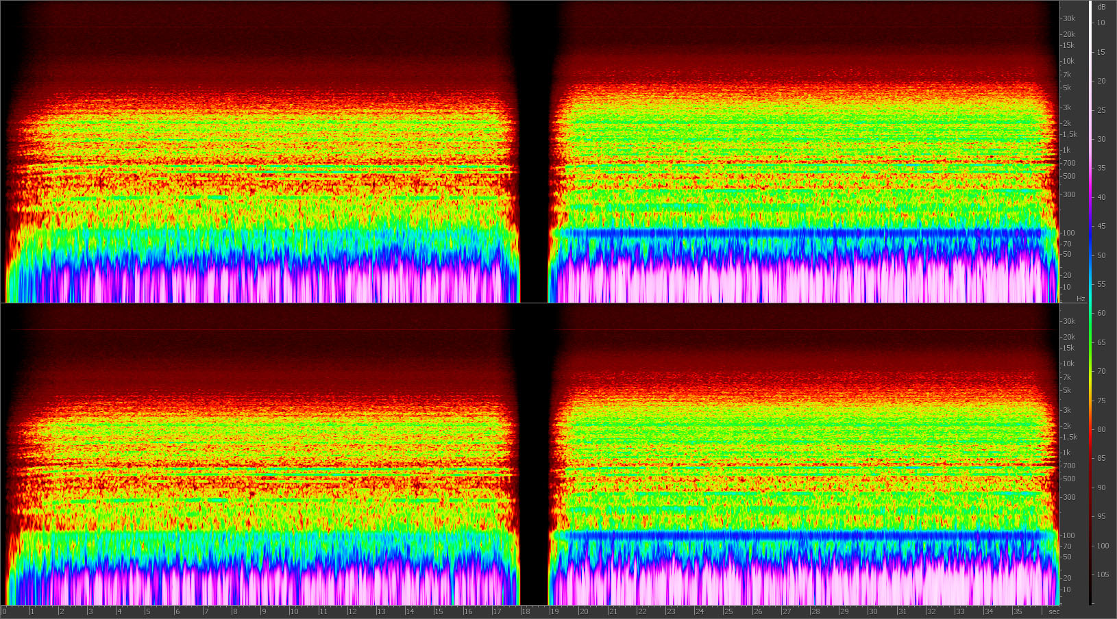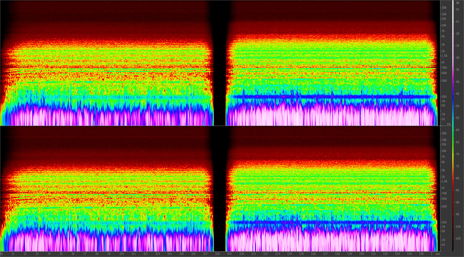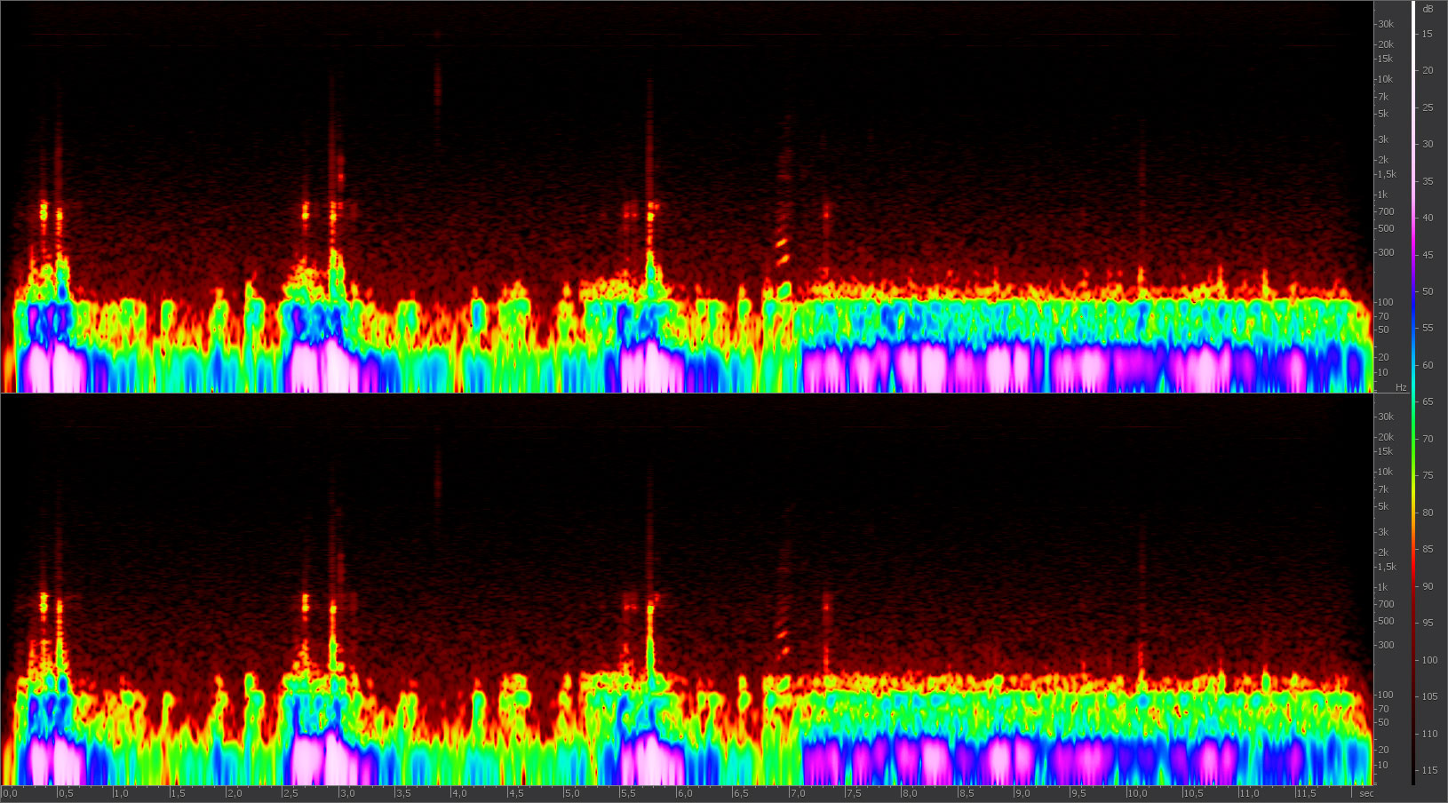 Before we start, here is a short explanation of spectrograms for those who haven’t seen one before: A spectrogram is the visualization of the frequency spectrum of a sound in relation to the dimensions time and amplitude. On the horizontal axis you can see a timescale and on the vertical axis on the right a frequency and amplitude scale, ranging from black (-115db) over red (-90db) and blue (-50db) up to white (0db). Because we recorded in stereo there are two channels. Left one on the top and the right channel is on the bottom. We used iZotope’s RX4 export function for the spectrogram-screenshots.