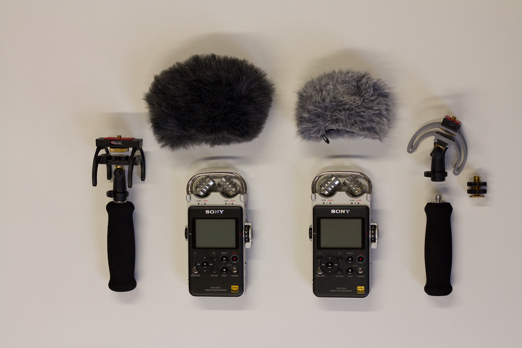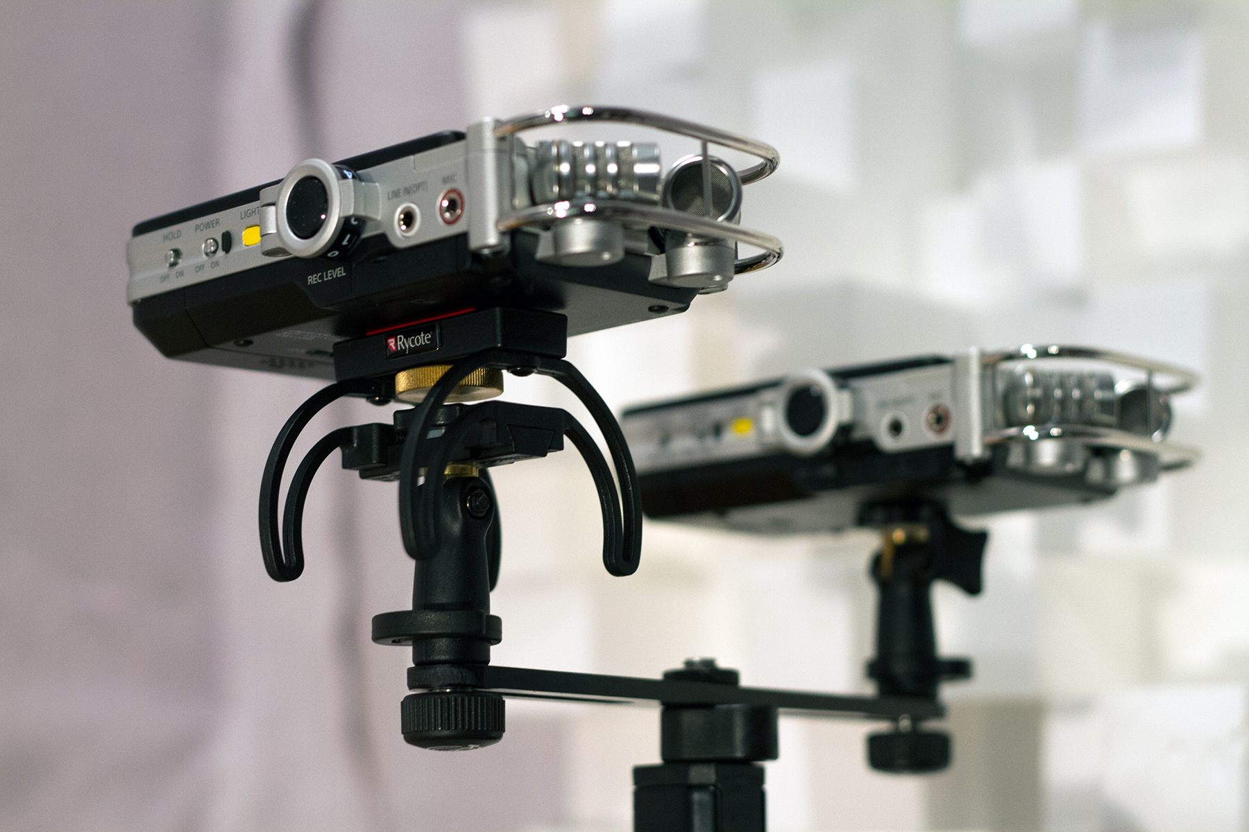 In certain cases we exaggerated testing conditions to a point where they’d be disastrous in any normal recording situation in order to properly illustrate the results. To ensure that both recorders were getting the same vibrations and handling noises, we mounted both of them on a stereo bar attached to a standard microphone stand. The recordings were made in one of our studios.
