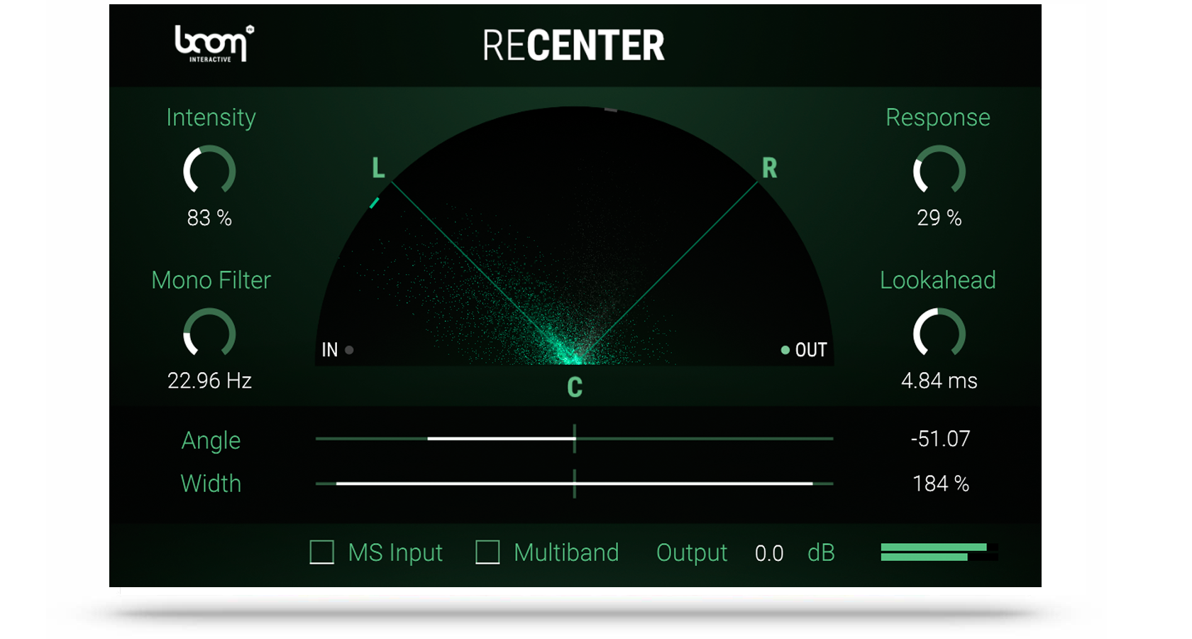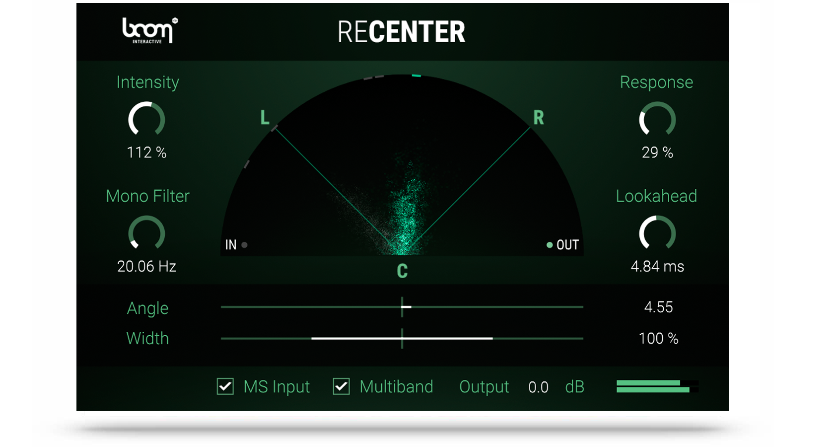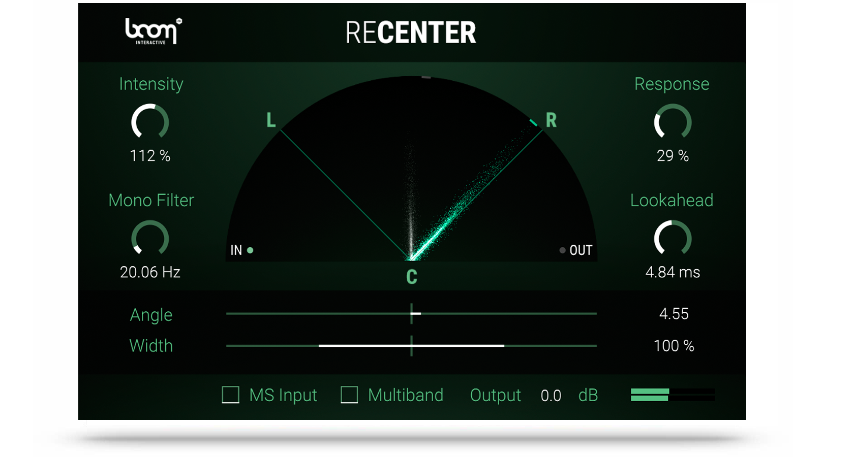 RECENTER is a stereo processor that constantly analyses an incoming stereo signal and dynamically rotates it to the center or a given angle without altering the stereo width. Having the incoming signal centered, you can narrow or widen the stereo image within RECENTER. For a better low frequency control you can mono the original signal below a set frequency. A multiband processing option intelligently shifts more complicated signals.