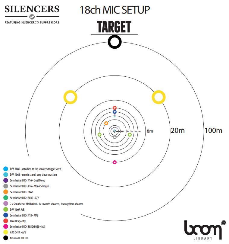 Silencers has been recorded with an 18-channel microphone setup. This enables you to place your shooter anywhere you want (far, distant, front, back, side). The 18 separate channels are only included in the Silencers Construction Kit. In the Designed edition, we created pre-designed sounds in various different styles by using the 18 different channels.